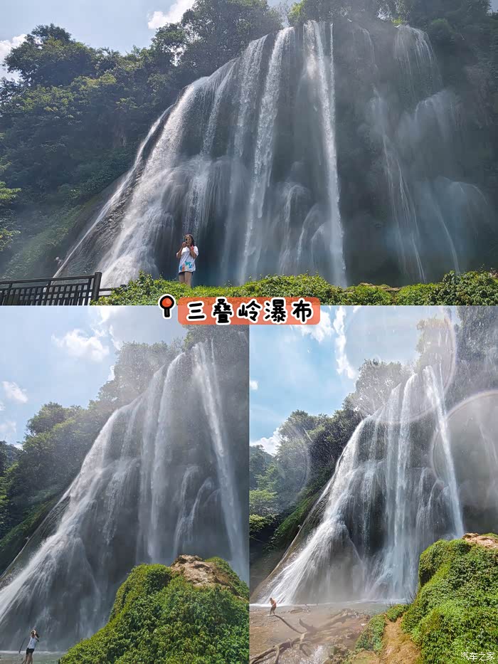 【三叠岭瀑布】是崇左去靖西路上的野生瀑布,就在219国道边上,和通灵大峡谷距离15分钟车程。附近有一个停车的地方,停车费6元,然后徒步上山大概10分钟,上山拍照下山约40分钟左右。瀑布很大一定会湿身,可以换个拖鞋上去,记得打伞或穿雨衣。