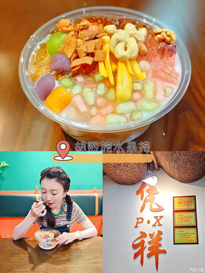 ?胡熙施水果捞:水果和小料特别丰富也很新鲜,点了一份全家福,满满一大碗,夏天吃真的很清凉,不过加了那个拉丝玉米有点黏糊糊的,第一次吃还是不太习惯,但是味道还是好吃的,一大碗都吃完了(我们去的实体店,摆摊摊位有2家,靠近实体店的那家摊位才是他们家的,另一家说是他们老表开的,味道不一样)