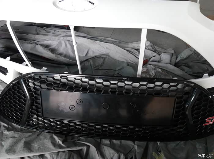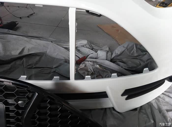 喷好漆的前杠,色差不错,前杠中网位置的三条杠是为了防止物流运输时变形,装中网前是要锯掉的