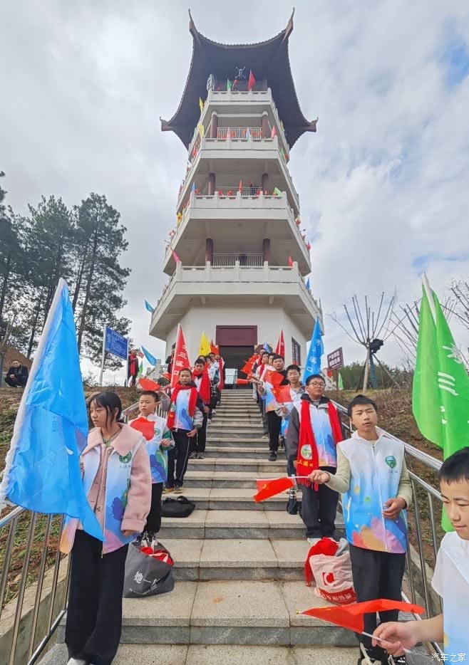 研学活动的最后一站,是林场最高处的景观塔。这座五层的六角形塔楼,不仅是林场的标志性景观,更是一座森林防火瞭望塔。同学们分层列队站在塔楼上,挥舞着国旗和彩旗,齐声高唱《我和我的祖国》《今天是你的生日,我的中国》,悠扬的歌声在山谷间久久回荡,为这场“走进绿色课堂,共护生态家园”的校地联动研学之旅,画上了圆满的句号。