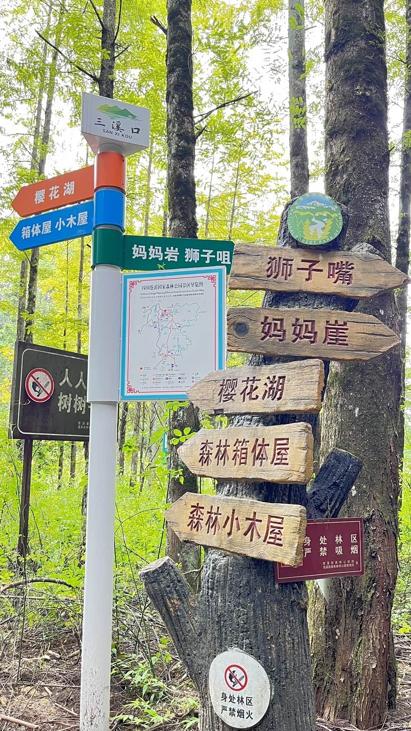 林荫道的拐角处,立着一块景点指示牌,上面清晰地标注着妈妈岩、狮子嘴、樱花湖、森林箱体屋、森林小木屋等多处景点,让人忍不住想要一一探寻。