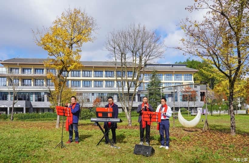 正沉浸在美景中,身后传来了孩子们的欢笑声,原来是研学队伍也抵达了这里。我们索性加入他们的行列,见证这场别开生面的研学活动。酒店旁的草坪上,四位老师正拿着笛子、电子琴、电吹管演奏乐曲,悠扬的旋律在林间回荡,引得孩子们阵阵欢呼。