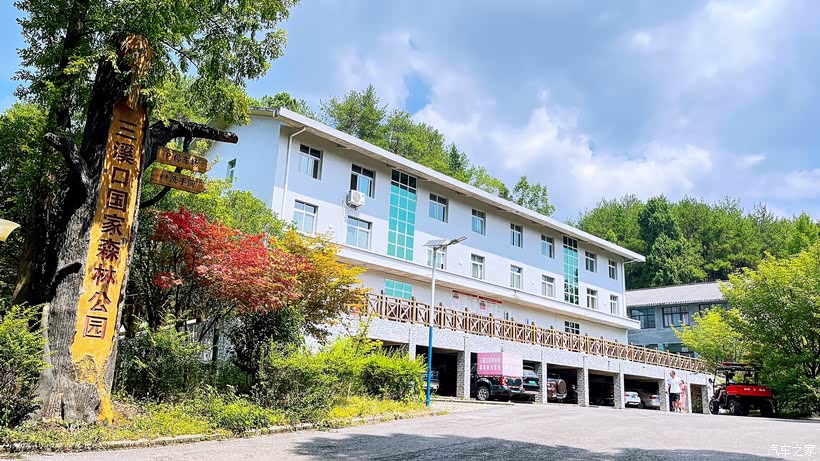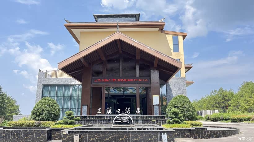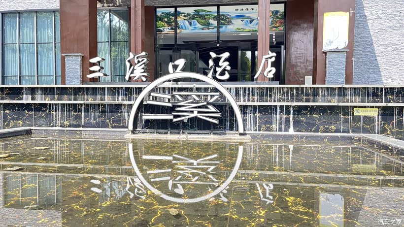 我小心翼翼地驾车驶出队列,生怕惊扰了这朝气蓬勃的氛围,没多久,造型别致的三溪口酒店就出现在眼前。酒店正门的水池旁,立着一个变体的“溪”字形LOGO,巧妙地将“三溪”二字融入其中,在池水的倒映下,显得灵动又雅致,让人忍不住驻足拍照留念。