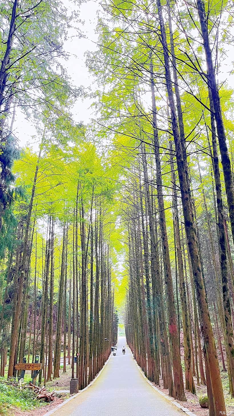 沿着酒店旁的小径徒步,很快便踏入了林场的主干道。眼前的景象,瞬间让我们忘记了路途的疲惫,满心只剩下震撼。一条笔直的沥青路向着森林深处延伸,仿佛一条通往童话世界的时光隧道。道路两旁,是密密麻麻的水杉树,高大挺拔的树干直刺苍穹,绛红色的枝干上,叶子已然褪去翠绿,染上了金黄的色彩。阳光穿过枝叶的缝隙,洒下斑驳的光影,落在路面上,也落在我们的肩头。