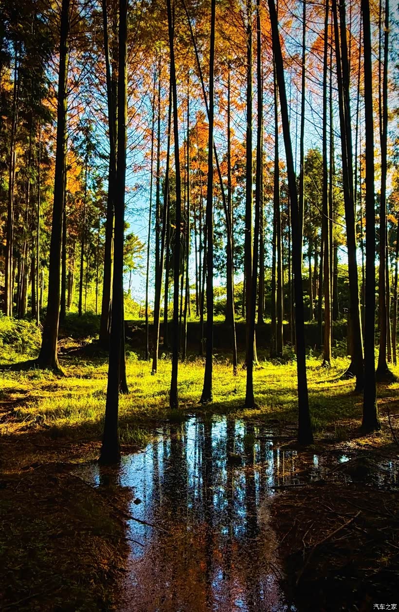 不知不觉间,午后的阳光渐渐变得柔和。秋日的暖阳穿过水杉树干,在草地上投下一片片耀眼的明黄。天空的湛蓝倒映在一片水泽中,像一面澄澈的明镜,映出树干的黑色剪影,红黄蓝绿交织在一起,宛如上帝打翻了调色盘,美得让人移不开眼。