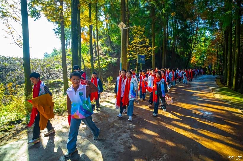 过了检查站,车子刚驶入林区腹地,前方的景象就让我们眼前一亮——一支整齐的队伍正沿着林道徒步前行。走近一看,原来是高坡初级中学的研学队伍,孩子们穿着统一的马甲,脖子上系着彩色的围巾,手里挥舞着鲜艳的小红旗,在老师的带领下,步伐铿锵,欢声笑语洒满林间。