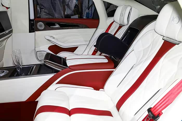外观上,红旗H9+延续了普通版车型的设计,配色采用红白双色车身,外观最明显的是针对轴距进行加长,B主除了采用亮面银色饰板外还加入特殊标识来表明身份。车头采用了大量镀铬进行装饰,搭配两侧造型夸张的雾灯区域,十分符合行政级轿车的身份。车尾则传承品牌横纵融合的尾灯理念,采用纵向北斗星轮廓,内置四横四纵LED光源。