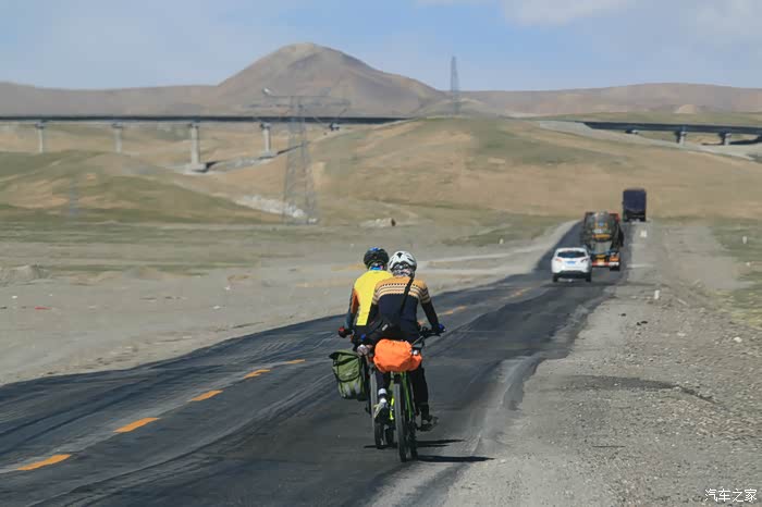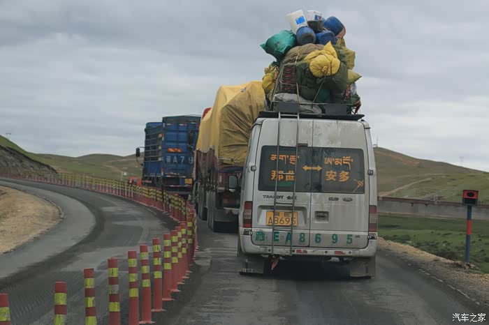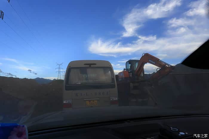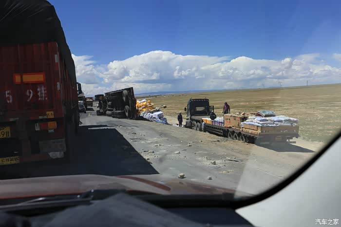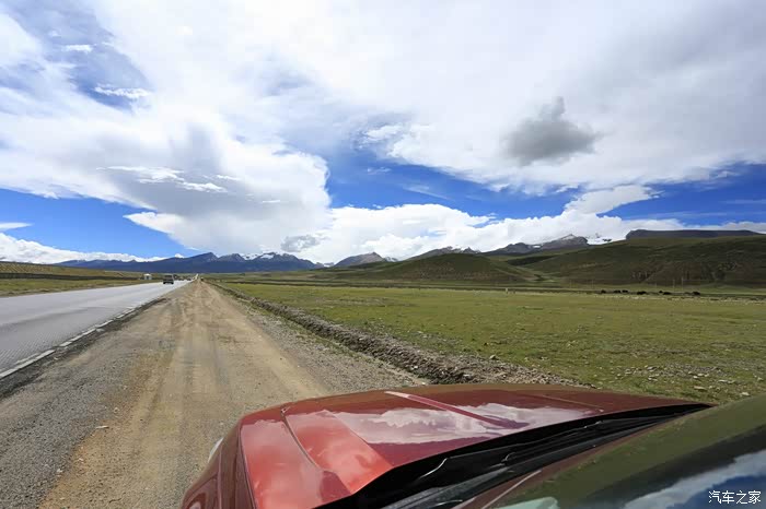 在暴土扬场的土路上行驶。路面越来越破,还要避让对面来的大货车,小轿车越来越吃力。果然,我前面的小轿车陷了车,出不来了,破路也被它堵住了,谁也过不去,旁边一东北牌照大车司机比较热心,下车过来帮着推车,我也下车帮着推!小车在大家的帮助下推了出来,可以前行了,但我忘了这是海拔四千多的高原,稀薄的氧气没有给刚来的我留任何情面,回到车上的我差点没死了过去,脸都快绿了,心差点没跳出来,缓了半天才好,吓人!所以,对刚入高原的人,做事情力所能及,推车要慎重!