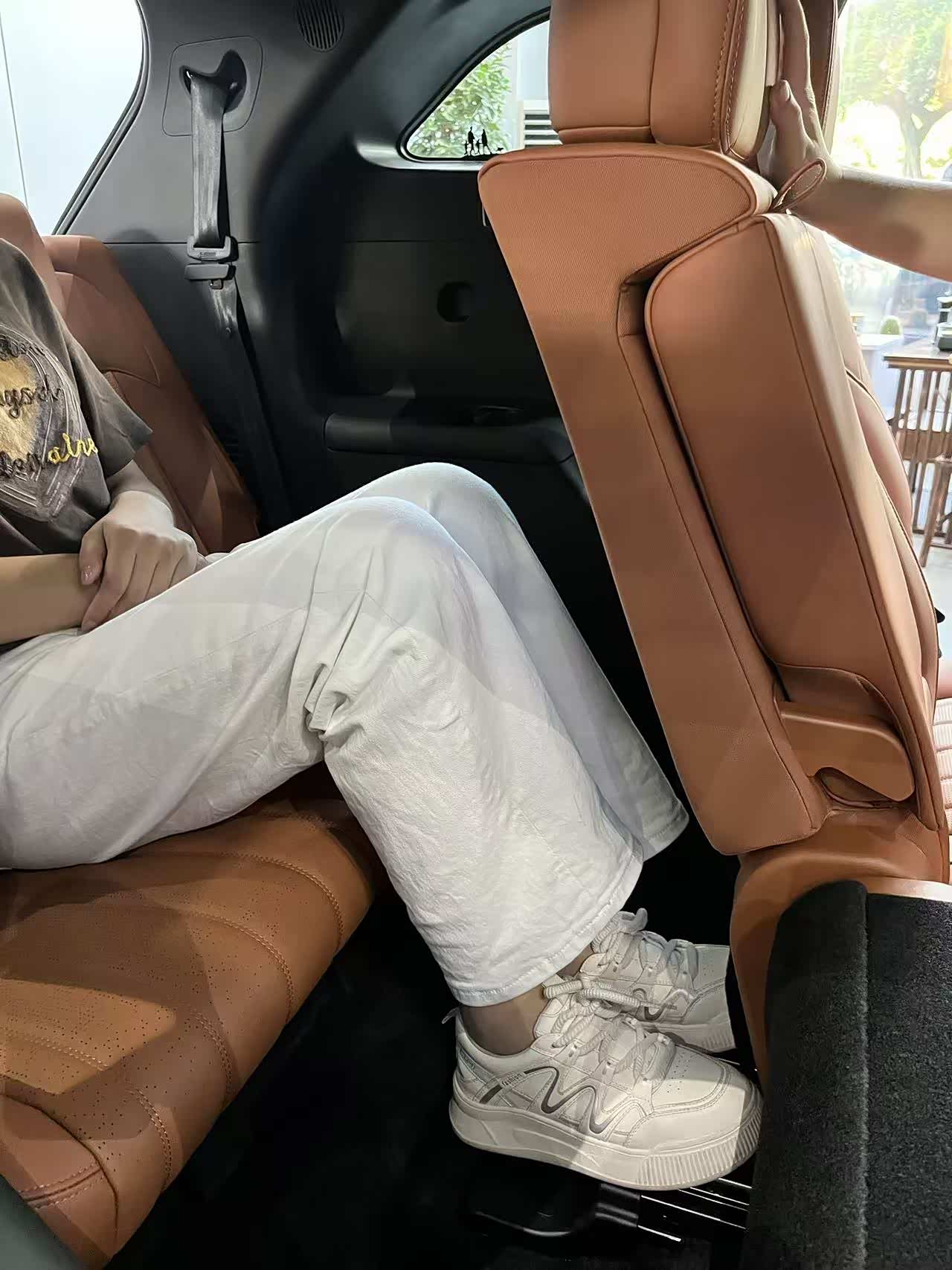 试驾的5座版是主销配置,我调整好主驾座椅(座椅降到最低,靠背角度刚好能舒服靠住),头部还有一拳两指的空间,不会有压抑感。重点看第二排,保持主驾位置不变,我坐到第二排,膝盖离前排座椅还有两拳多的距离,就算翘个二郎腿也不费劲——这点比我现在开的紧凑型SUV强太多,之前带爸妈出门,我妈总说“腿伸不开”。后备厢也够能装,销售当场演示,放了两个28寸的行李箱,旁边还塞下了一个折叠婴儿车和几个购物袋,日常家用完全够。