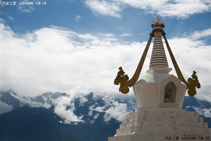 乌云中的一点蓝。在行进中,我们还碰到一个雄赳赳气昂昂的藏族的摩托车队,十辆左右,每个后座都载一个小伙子,从我们车辆旁呼啸而过,依次大声祝福我们:“扎西得勒!”这突如其来的气势宏大的美好祝福让我们受宠若惊,只来得及回赠回去:“扎西得勒!”却没能留下他们的影像。可他们的笑容却一直留在我们的回忆里。