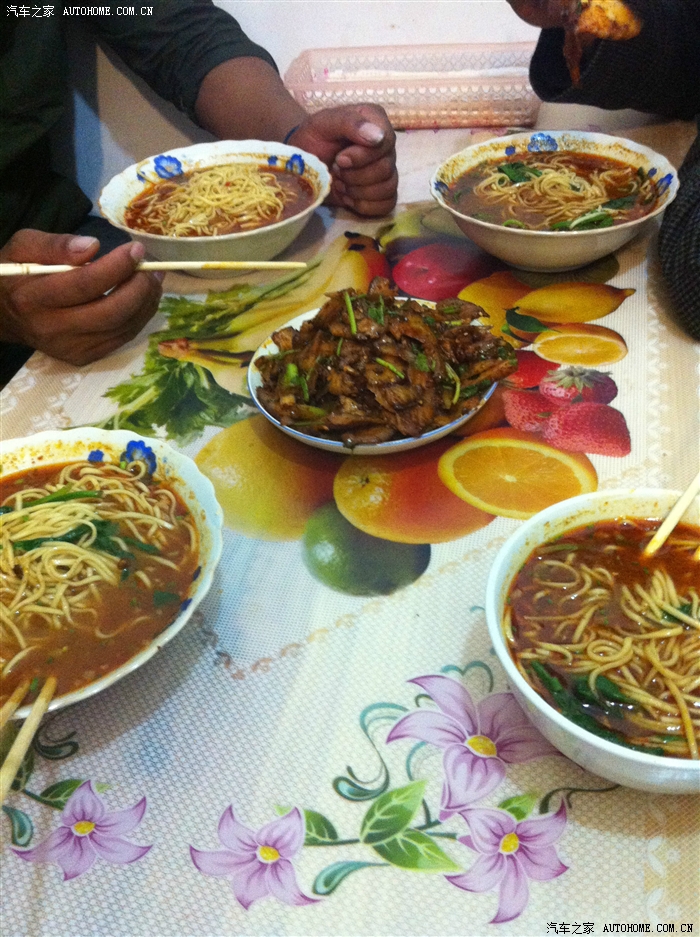 !中间这个白衣帅小伙姓刘,是这个饭馆的老板。他非常可爱和健谈,唱着歌给我们做饭,还送了于秘一碗热腾腾的长寿面!