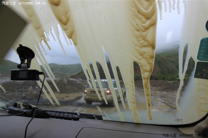 就在这时周董驾驶狮跑在颠簸的路上疯跑着,他说他怕这里的“张麻子”,所以想快点离开这里。这一段路基比较宽,可就是很破,有很多大泥坑,结果他的车超过我们的时候压过一个泥水坑,溅起一大滩泥浆,从头到脚泼了我们车子一身,瞬间就什么都看不见了。赶紧刹车,这种路况看不到太危险了。全车人都吓了一大跳,哪见过这样的情况!雨刷刷了一下之后才想起来拍照留念。当时真的是全被泥蒙住了的,一点缝都没有哦!由于狮跑速度太快,也不小心冲过了路口。