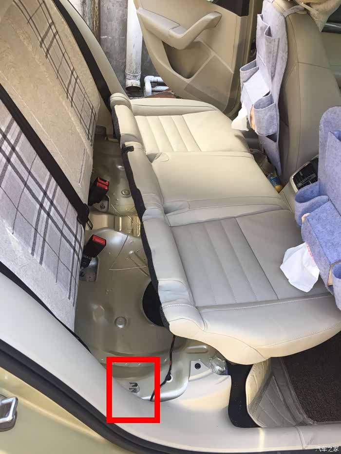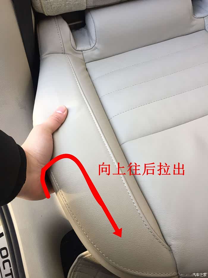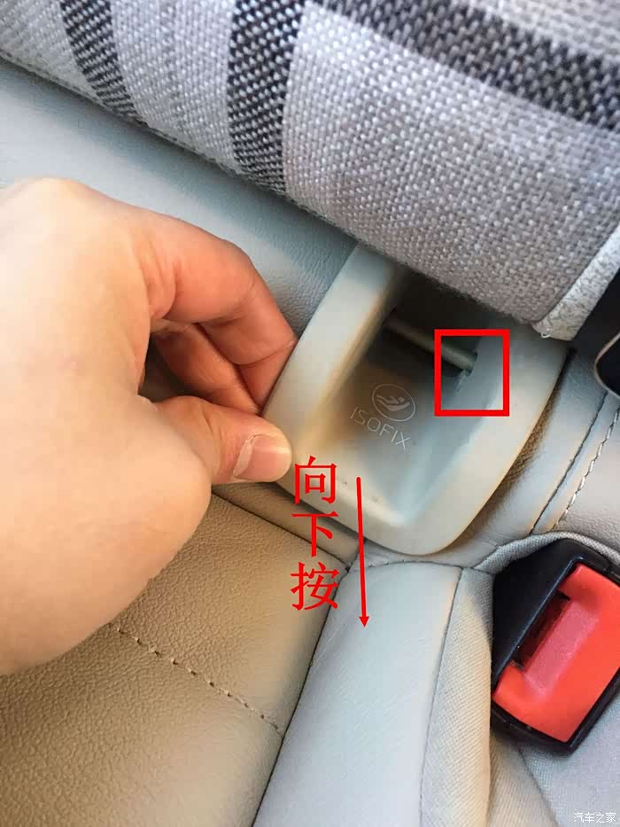 先拆了4个ISOFIX卡扣,注意先向下按,注意矩形框内位置,然后就可以拉出。