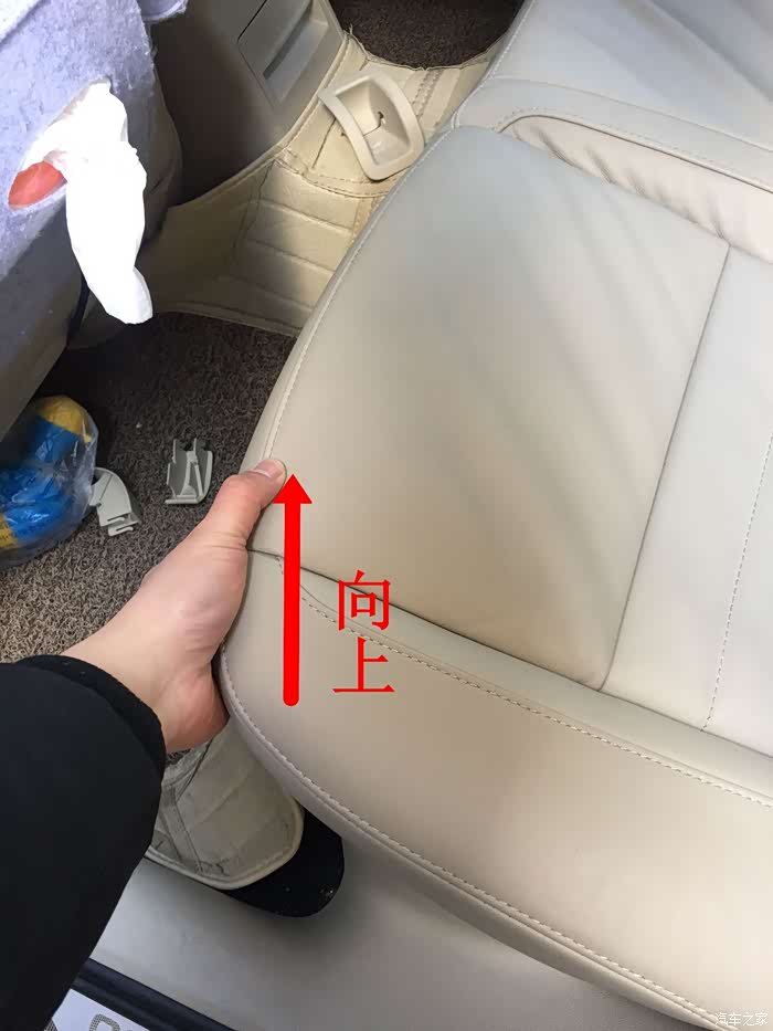 4个卡扣拆了后,就可以向办法处理坐垫了,在坐垫的两侧,点头标记的位置向上拉,听到嗒的声音时座椅下的第1个卡扣就出来了