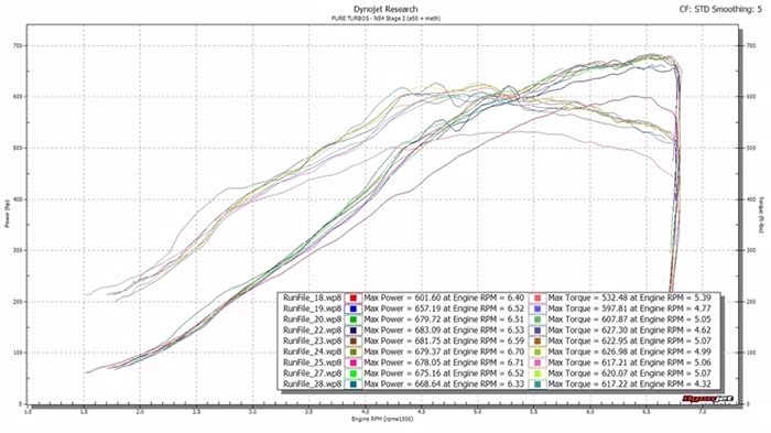 更换涡轮后就是轮上500匹打底了,根据这些年N54车友玩下来的经验,调教正确,发动机在轮上600匹以内都不需要强化。在更换活塞和连杆之后,目前已经有接近轮上1000匹的案例,不过那些离我们太远了,轮上500-600匹才是一般车主的归宿(提升和平衡的最佳点)。