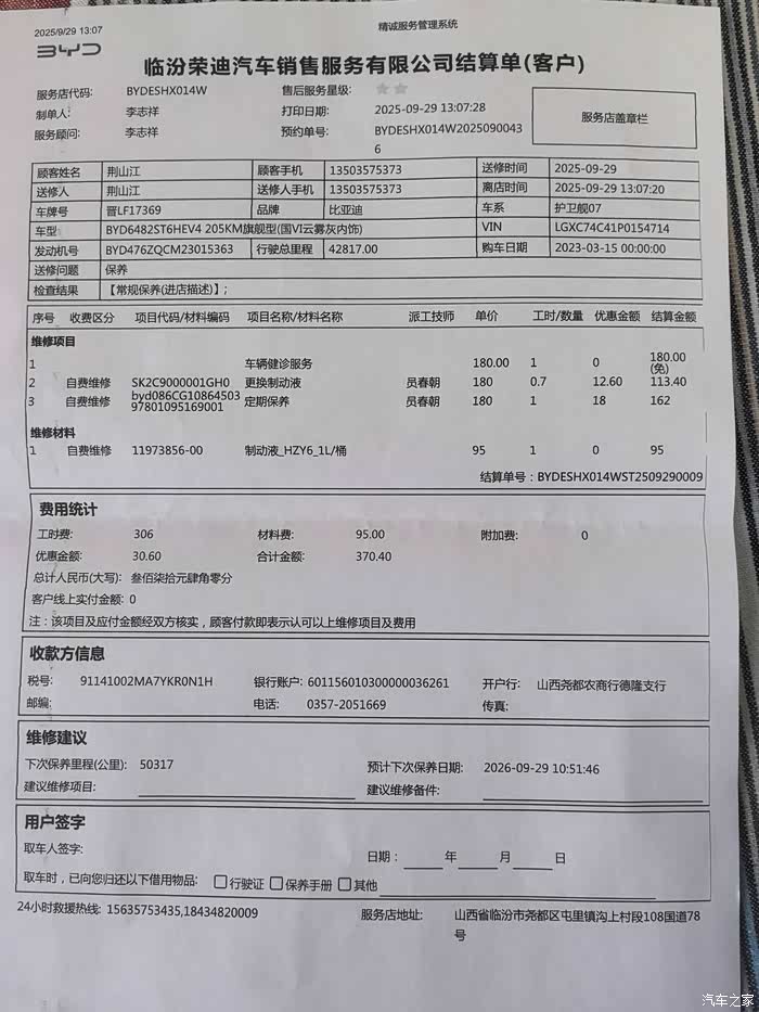 3、保养价格:单纯的电保养价格是180元,因为我提前进行了预约,所以打折以后实际收费是162元。更换制动液工时费是113.4元。制动液材料费是95元。车辆的健康诊断服务180元是免费的。合计实际支出总金额是370.4元。