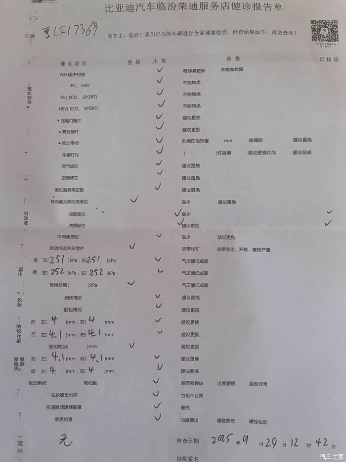 1、保养项目和步骤:店保养的项目和内容相对比较简单,主要就是用仪器对车辆做一次全面的健康诊断检查。主要的检查内容如下:EV和HEV模式转换;充电口弹簧片;高压部件;动力电池;车辆灯光;空气滤芯;空调滤芯;制动踏板限位垫;转向助力泵油液液位;油壶液位;油脂颜色;冷却液液位;发动机皮带及附件;轮胎胎压监测;轮胎划伤及鼓包情况检查;轮胎胎纹深度检查;制动系统及制动盘检查;车轮螺母力矩检查;变速器滤清器检查;底盘检查。