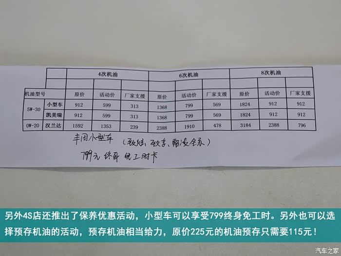 保养方面,其实我上一篇大篇幅的聊了保养的事情,但是并没有太深入的告诉大家如何保养省钱,在这里我给大家透漏一下深浅的秘籍,保养要省钱,首先是网上预约,时刻关注官网以及店内的优惠活动,据我了解,丰田4S店每年都有针对保养的一些折扣优惠,正常一次小保养在410块钱左右,提前预约+门店的一些优惠,一次保养的费用基本在300-350之间,保养成本非常的低。