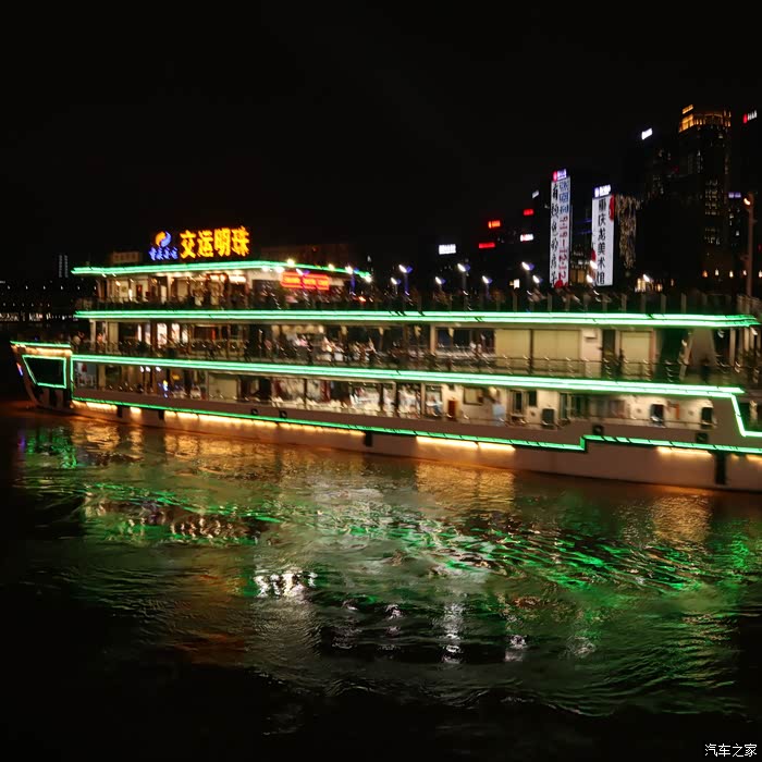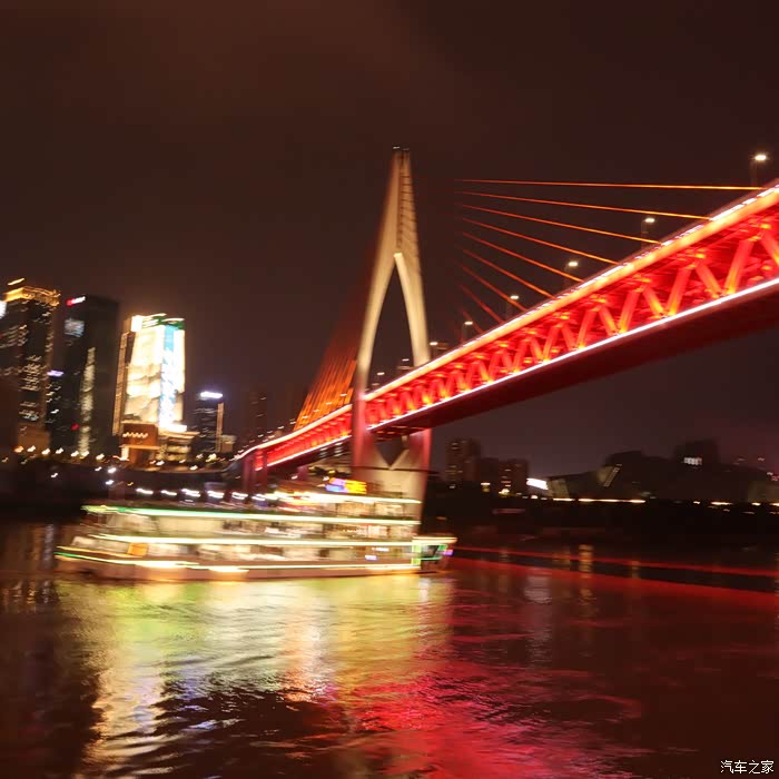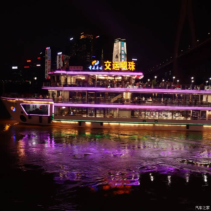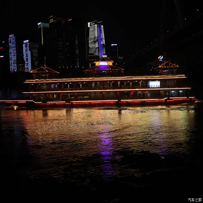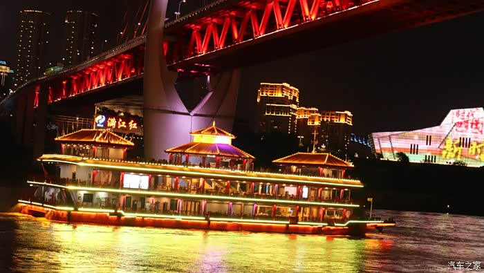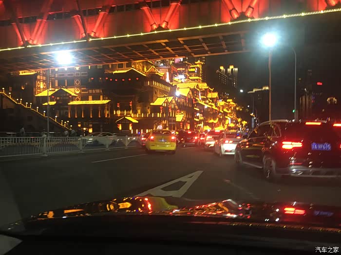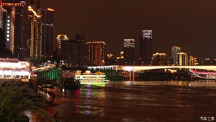 晚餐在这里品尝了 重庆 特色小吃冰粉和 东北 煎饼,饭后缓步到 重庆 观夜景最佳地——洪崖洞观景台,打算夜观洪崖洞。由于时间较早,才5点半,天还没有黑,便在观景台耐心等着。谁知道 重庆 的夜景灯到8点才完全开放,这一等就是两个多小时。直到8.05分南岸的 中国 农业银行、 重庆 中国 银行、 重庆 龙美术馆、交通明珠等高层建筑的灯光才打开,确实壮观。尤其是千厮门大桥的红色灯光与长江中航行游船的绿色灯光交相辉映,绚丽多彩。驱车返回途中,在公路边夜观洪崖洞夜景,只见一片片金黄色的灯光映射中的一排排仿古建筑,座座房子仿佛像镶了 金边 ,在洪崖洞古迹洞口旁简直美不胜收,观夜景的游客和市民人山人海,造成交通拥堵,大批交警在疏散着人流,给我留下了极为深刻的印象。回到 重庆 汉庭 大学城 酒店已经10点,我们已经准备休息了,但是 重庆 五彩缤纷的夜生活才刚刚开始......