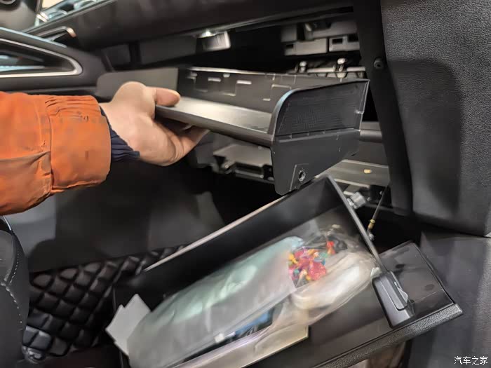 空调滤芯在副驾驶手套箱后方,打开手套箱,向内侧挤压两侧阻尼限位器(应该是叫这个名字吧,就是一个带齿轮状凸起的部件),将手套箱向身前倾斜,缓慢拉出(一定不要暴力拉扯线束)。然后就可见白色塑料盖板,按压盖板右侧弹性卡扣向驾驶员方向滑动盖板约2cm即可取下,放入新滤芯按照原有顺序反向复原即可。