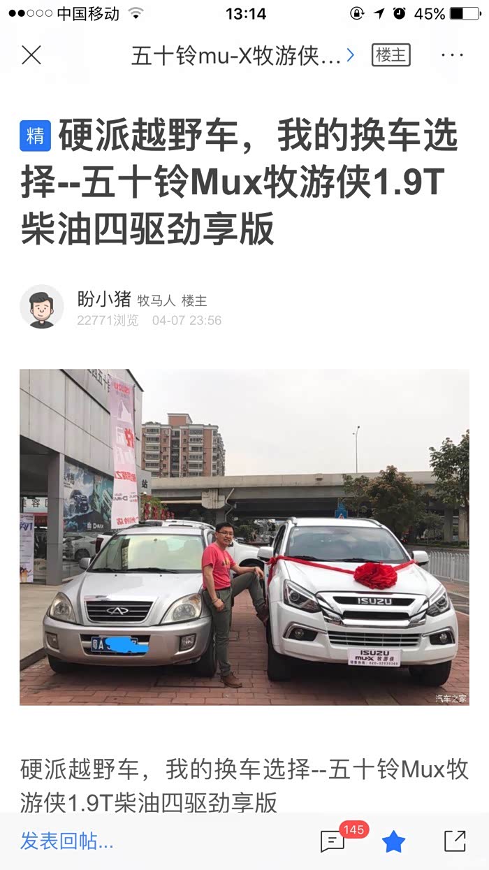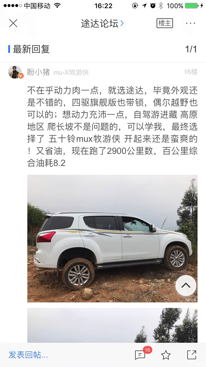 本人二师兄,五十铃mux牧游侠1.9T四驱五座劲享版车主,2018你1月底才知道五十铃mux2018款-牧游侠上市,得知牧游侠与老款母夜叉相比,发动机性能(1.9T强过停产的2.5T)、内饰档次、配置、隔音效果都大幅提升,周末两天之内到 广州市瑞铃汽车销售服务有限公司试驾了两次,就订了车,3月初提的车,差不多三个月跑了将近7000公里数(三分之一广州市区上下班堵车路+三分之二高速公路长途,偶尔去山间烂路体验一下牧游侠的四驱功能),百公里综合油耗8.1??????