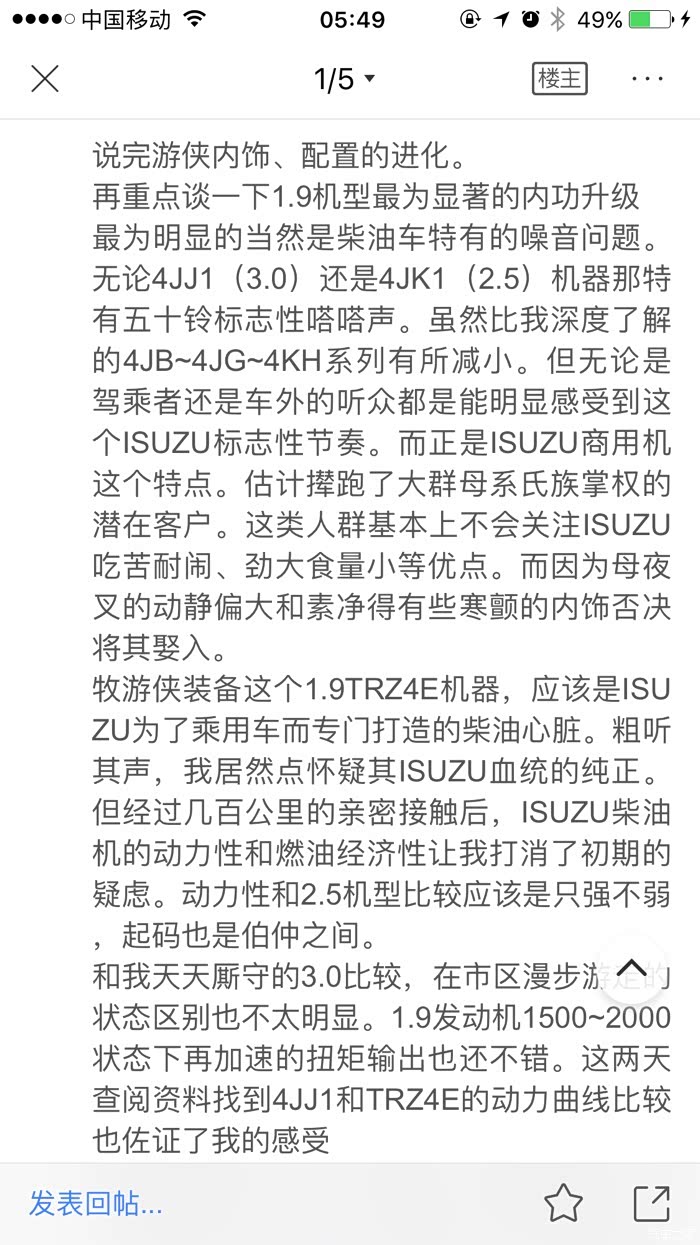 五、厂家宣传力度不够,导致很多在乎车的内涵的人无法了解到牧游侠的牛逼之处(五十铃发动机波箱大梁三大件蛮不错;1.9T柴油发动机的动力强悍、静音、省油,65L的油箱加满柴油可以跑800-900公里,非常适合长途穿越;内饰配置和整车隔音效果相比老款脱胎换骨;底盘高四驱越野功能牛叉;高速开起来静音稳重,提速不错,3.0T动力更爽)。