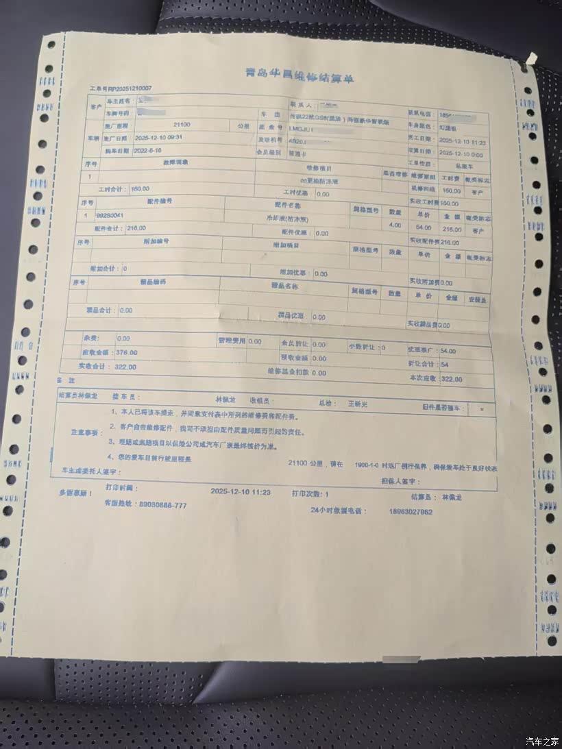 维修保养完毕,来到结算环节,喇叭在保质期内免费更换,更换防冻液优惠后消费322元,对这次4S的服务满意。