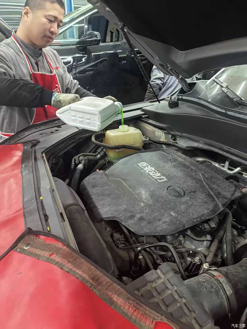 倒入新的防冻液,大8用的是绿色,小伙伴们记住颜色不同的防冻液是不能混用的。