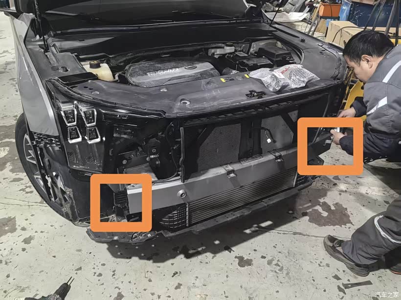 到店后技师手法很熟练,先拆中网后拆杠,这就是拆完后的样子,图中方框内就是喇叭的位置,左右各一个。