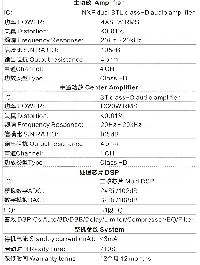 1、标题是5.1声道数字功放,是不是五星级那等到改好后才知道,先科普一下5.1是什么来头,(问度娘)5.1声道是指中央声道、前置左、右声道、后置左、右环绕声道,及所谓的0.1声道重低音声道。一套系统共可连接6个喇叭。 中央声道喇叭,负责再生配合屏幕上的动作,大部分时间它是负责人物对白的部分;前置左、右声道喇叭,则是用来弥补在屏幕中央以外或不能从屏幕看到的动作及其他声音;后置环绕音效喇叭是负责外围及整个背景音乐,让人感觉置身于整个场景的正中央。万马奔腾的震撼、飞机从头顶呼啸而过的效果,就是由它所赐;而马达声、轰炸机的声音或是大鼓等震人心弦的重低音,则是由重低音喇叭一手包办。这套系统的优点在于可获得更清晰的前面声音、极好的音场形象和更宽阔的音场以及真实的立体环声,从而可以聆听到前所未有的背景中的细微声音移动(作者描述很性感,实际很骨感,应该只限局于家庭音响,车载音响唯恐难实现)。
