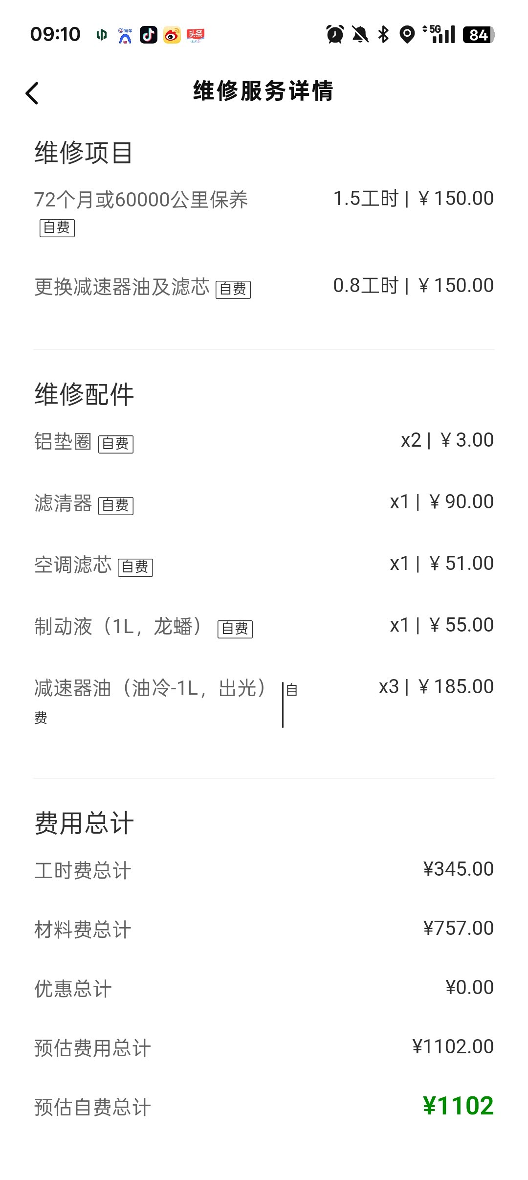🚘整个六万公里保养耗时2小时29分钟,提前预约时间确实更快,上次五万公里保养没有预约多花了一个小时多,一共花费1102元,其中工时费345元,材料费757选,这个价格贵吗❓😜去年海口零跑服务中心将工时费从100元提高到150元,所有收费项目都需要线上签字确认,透明合理。至此整个六万公里保养圆满结束,十分满意😎❗