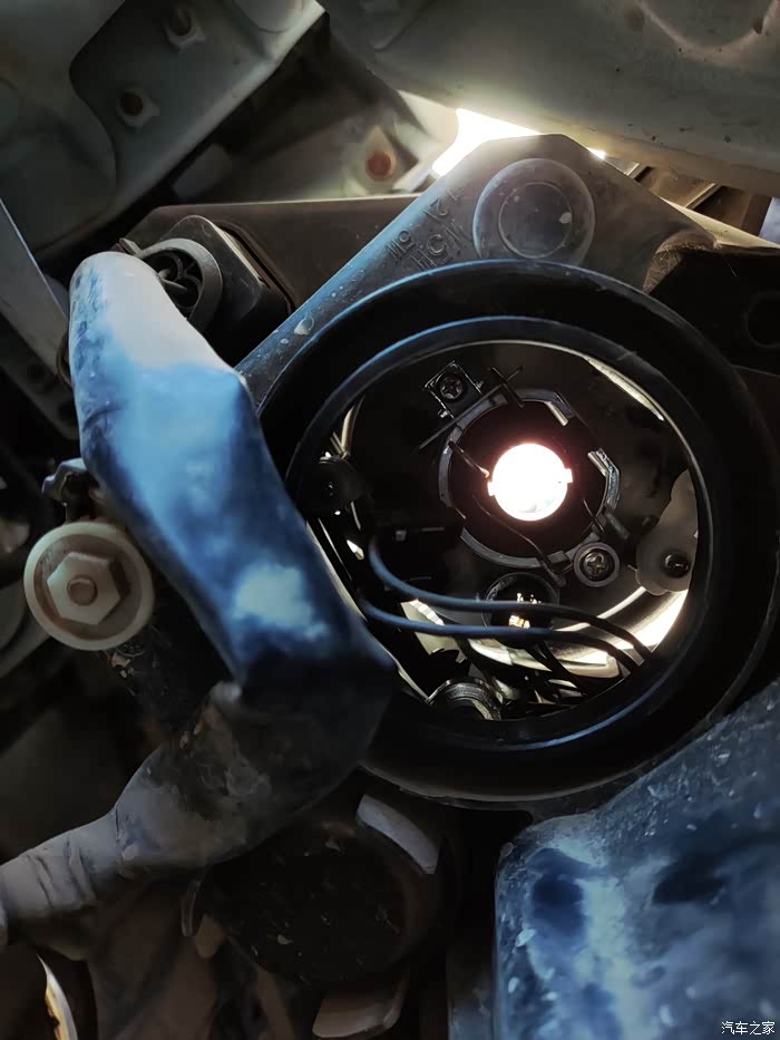 面对车子,右手边很难弄。左手边我中午把防冻液壶拆了。三个螺丝就拿下来了倒是很简单。然后视野一下就好了,爬在车上能看看具体细节。十分钟搞定了。等待晚上,调光。
