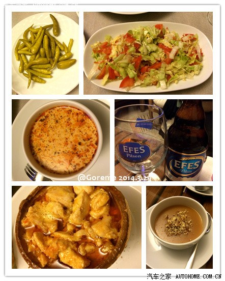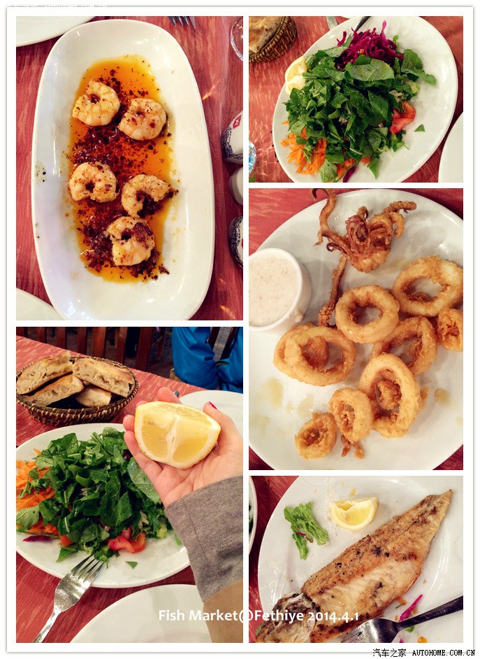 坐下后,要了一瓶水,最先上了虾,是蒜和辣椒一起炒的,闻着特别香,一口咬下去,香味儿就充满了口腔,超级好吃呀!鱿鱼一般啦,就是炸鱿鱼圈。鱼不错,烤的很嫩,分成2个盘子,一人一半,烤完的鱼皮都是整个儿的,说明火候正好,很香~!小虾和鱼推荐!结账的时候发现23 TL,看明细是水3 TL,剩下一个20 TL,估计是加工费。男盆友怕麻烦也怕说不清,闹起来真出事儿我们也吃亏,就没让我细问,结账走人。结账的时候才发现刚才餐厅老板给我那3个硬币不是3 TL,是2.5TL...我又囧...回去路上我是一直都没算明白...男盆友说之前看攻略写土耳其人爱占小便宜...不知道是我们之前没问清楚还是真就被宰了,反正囧死啦!!除去这点,费特希耶还是个不错的小镇~