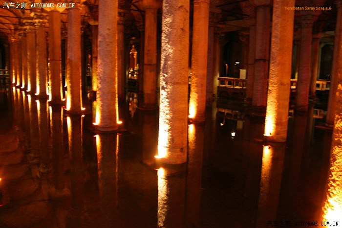 吃完后将近5点,我们赶紧向蓝色*寺走去,正好赶上礼拜时间,不让进,5点半之后可以,转战水宫~水宫门口也有很多人排队,6点关门,而且好像之前在老皇宫看到的通票是不包括水宫的,队伍走的很快,进到水宫,第一句是“哇~”一片幽暗的区域,被366根用光照明的柱子点缀,水池中一尾尾肥大的鱼穿梭往来,放佛随时会变为神话中的某种动物,颇为神秘,不时会有水滴到头上...更加增添了神秘感...顺着水宫的石板往里面走,有一个写着“美杜莎”的牌子,旁边还有介绍,说有两颗石柱将美杜莎头像压在了下面,我们对着牌子旁边的石柱看了半天,怎么也看不出美杜莎的样子,不时还有人对着石柱上面的坑指指点点好像就是美杜莎...走到水宫的最里面,终于看到了两个底座是美杜莎头像的石柱...蛇样的头发和空洞的眼睛雕刻的栩栩如生,有点瘆人..