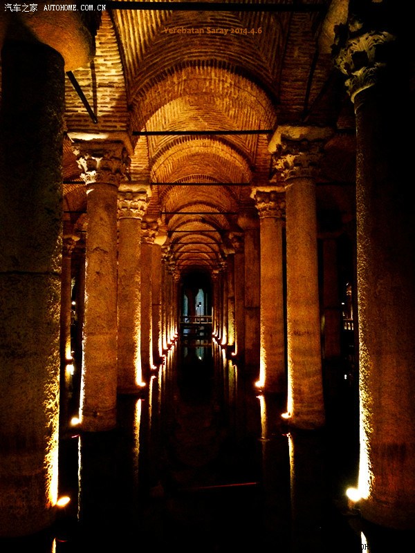“在伊斯坦布尔城中,地下宫殿为数众多,但耶莱巴坦地下水宫是其中规模最大的。整座水宫长140米、宽70米,336根高9米的粗大科林斯式石柱支撑着巨大的砖制拱顶,而这些石柱据说均是从安塔托利亚地区的神殿中搬运过来的。