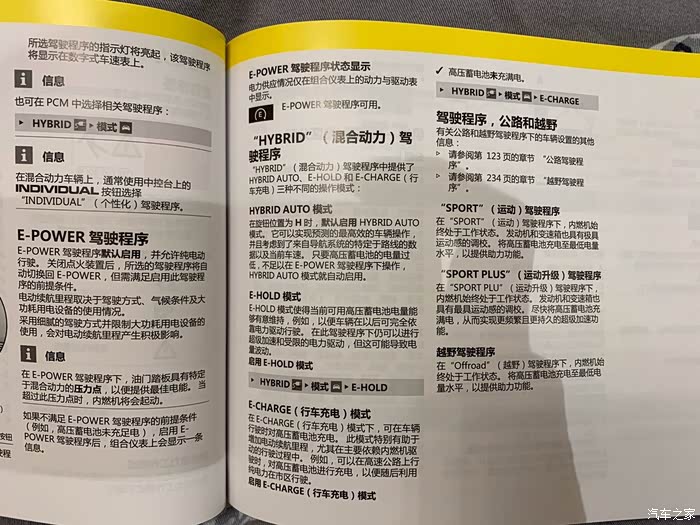 混动的驾驶乐趣多了好多,有很多种模式可选,混动加速好过3T,油电混合模式下踩过纯电的压力点发动机加入到电机的时候推背感强烈,3T卡宴和coupe试驾了几次加速度都不如油电,这个符合官方数据的加速时间,扭矩大的就更多。有些人感觉肉的,那是你处在纯油或者纯电状态,要让他一起爆发出来就明显爽多了!有些说2T的,还是要学习下这是2T+能纯电跑的电池组(不是电瓶)也不是2T。插混的电加速确实猛。下图说明书这页非常重要。