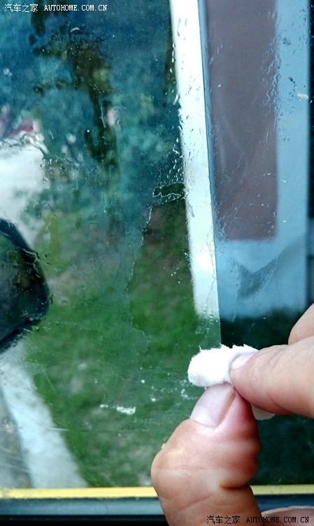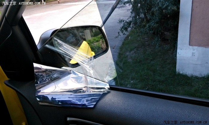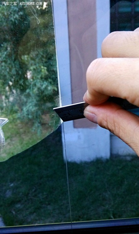 接下来是对贴膜下手了。刚拿到车的时候,所有的车窗都贴了非常深的膜,光线不太好的时候看后视镜感觉到隐患太大了,于是动手。先用美工刀在前窗膜上切了一刀,再用钢尺小心的把边缘抠整齐。