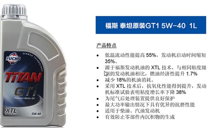 泰坦GT1系列机油是福斯品牌的高端全合成型机油,采用了酯类配方,对于发动机的保护性能更加优异,并且在车辆冷启动时即可提供出色的润滑保护性能,适合奔驰、宝马、大众在内的高端轿车,尤其对于涡轮增压车辆来说更为适合,针对性的配方设计可以更好的保护在更高温下运行的涡轮增压/缸内直喷发动机。