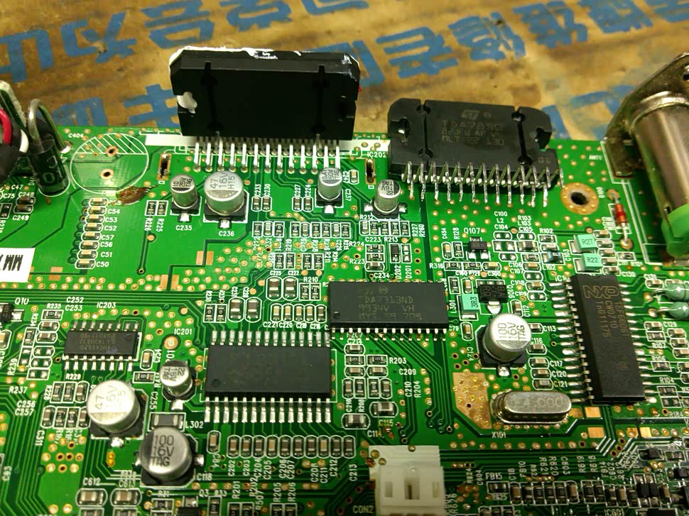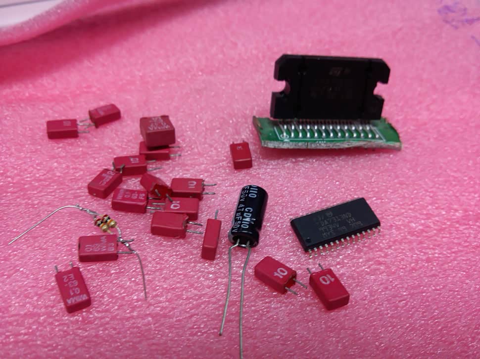 好了~接下来要看我准备的发烧级配件了哦!各位观众...4x50W保真汽车音响功放IC TDA7850,我用的是原装拆件,MLT生产而不是CHN的Made-in-China(shanzhai)正品3,5脚电阻3k左右,德国威马 MKP系列 63V 0.1uf(100nf 104)薄膜电容,数字立体声音频控制IC TDA7313,电解电容 25V10000uf 体积18*35