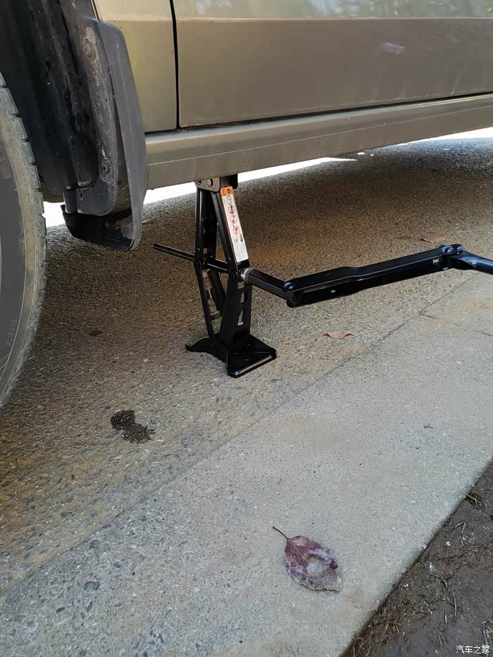 由于小区车位是那种带孔砖的,千斤顶不稳,安全起见小区外马路边开干。