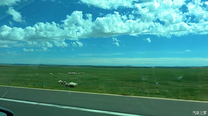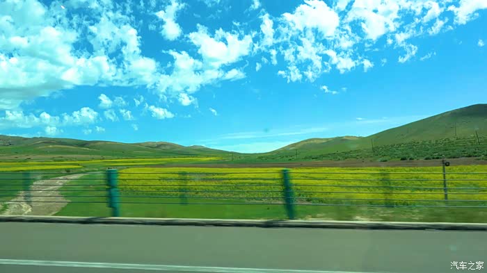 上高速了,晴朗的天空,大朵白云挂在天空,一眼望不到头的草原,沿途忽而是山地草原,忽而又是荒漠草原,在村庄附近还有庄稼和油菜花穿插期间。