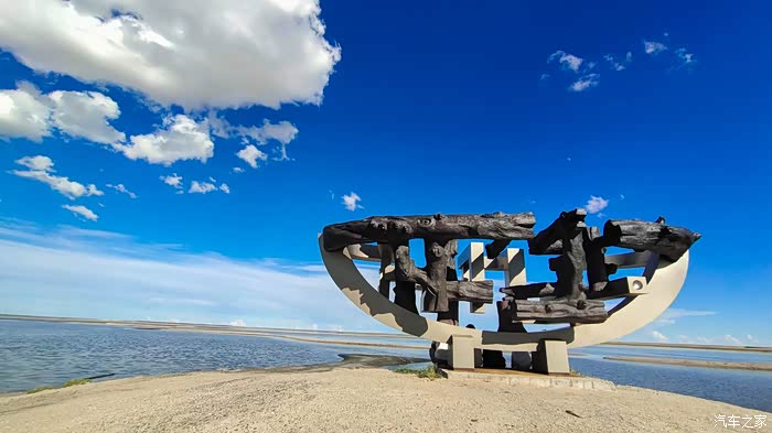 第二站,盐湖,免费,那是一种浩远飘逸之美。进入盐湖还穿越了一小段的沙漠,及至一座雕塑近前,艳光乍现,大片的荒漠草原中,在北国灼目的阳光下,一大片湖水湛蓝,周边还有很多的小湖水环绕,湖水时而随风涟漪,风停之后平静的水面,就是一面天空之镜。这般光景就是一幅大写意的草原画卷。在不远处,碰上当地的美女帅哥在直播。