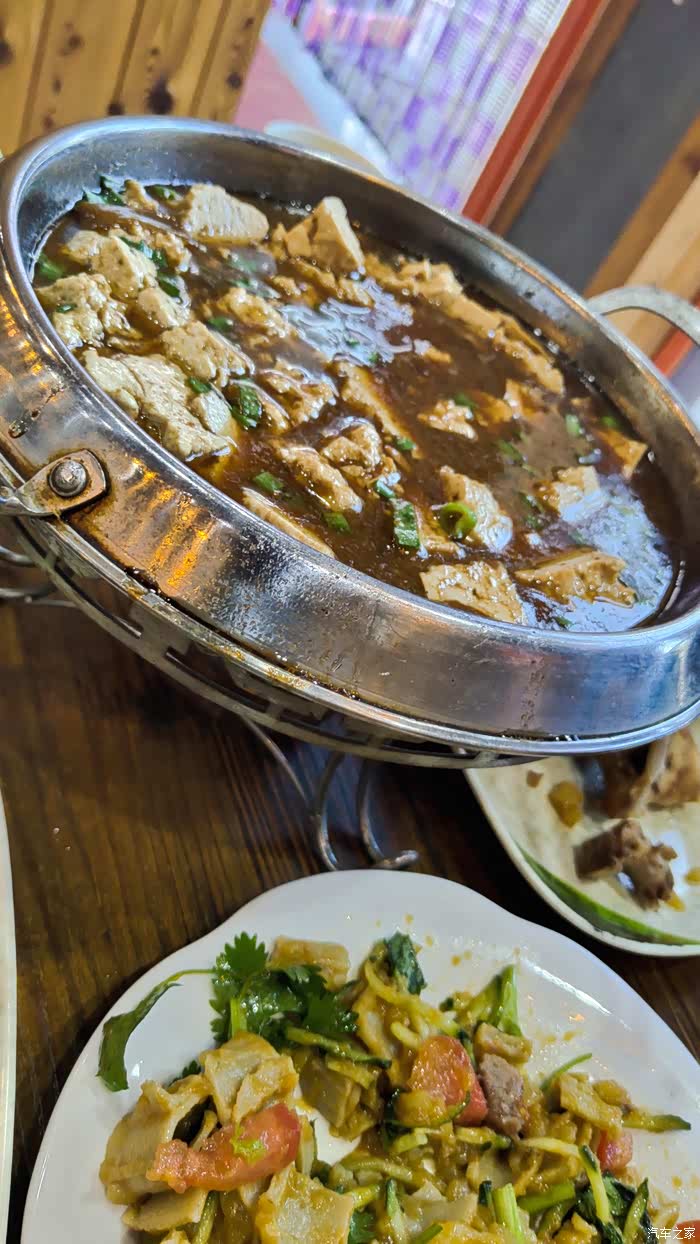 太阳落下了,肚子也饿了,回到镇子上,选了一家人气挺旺的餐馆,本地口味,推荐指数4颗星,差的1,门脸儿的牌匾标识该修修了。