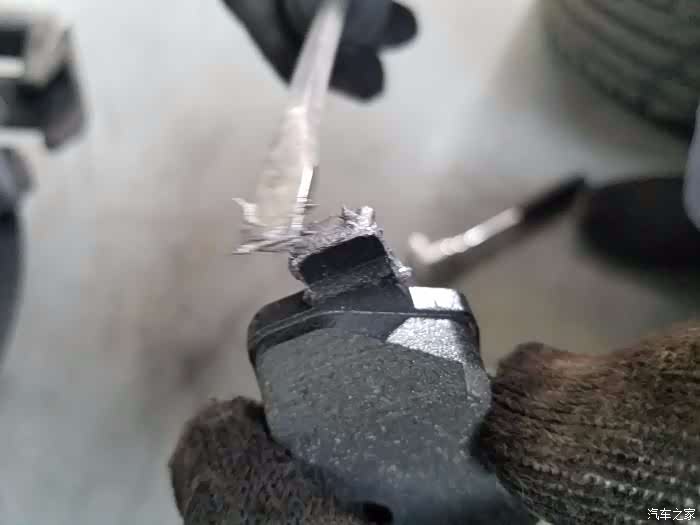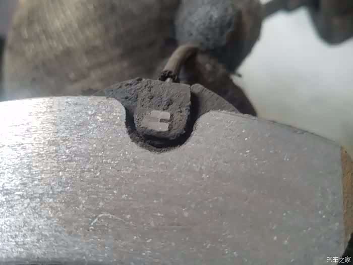 取下的刹车片,上车片上连着的就是刹车感应线,一般刹车片磨到报警铁片就会出现刹车报警