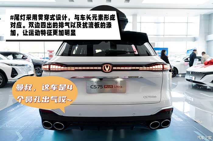 来到车尾,贯穿式尾灯是与前脸形成呼应的,来来来,看这个双边四出排气口,人家最多两个鼻孔出气,它直接上一对儿。