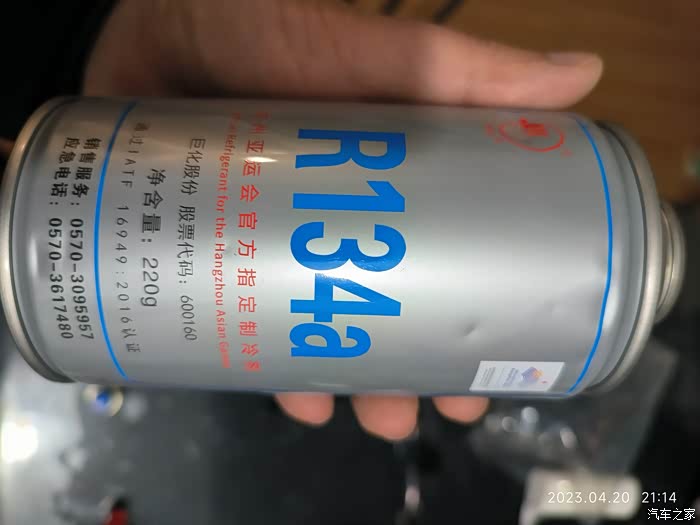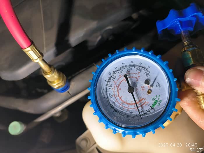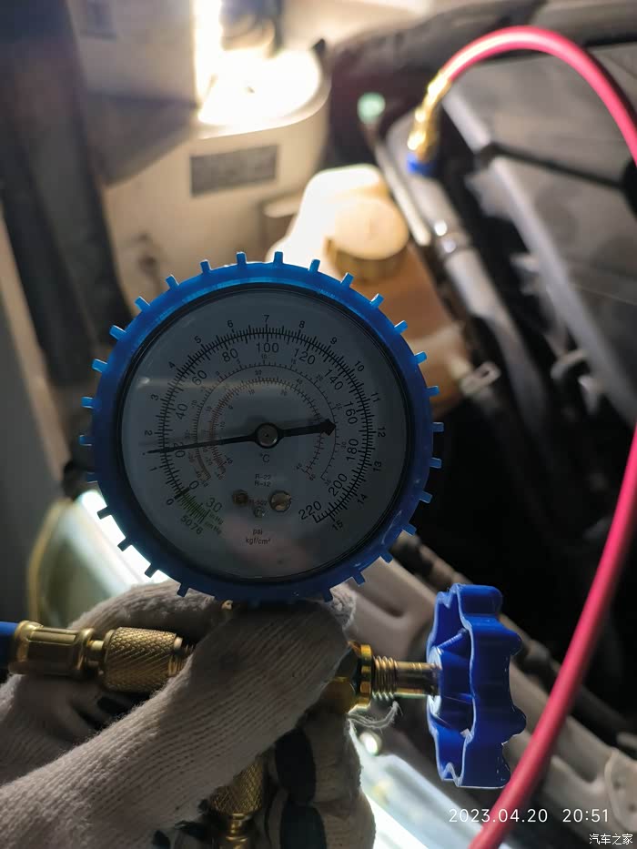 第一罐刚加注,就听到压缩机离合器吸合的声音,停工的压缩机又开始工作。