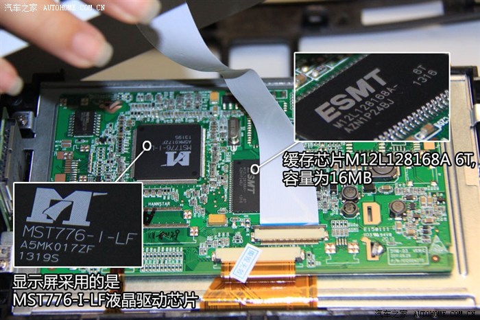 显示屏采用的是MST776-I-LF液晶驱动芯片,其品牌"MSTAR"普遍应用在车载DVD、显示器行业,MSTAR是全球最大液晶显示器控制IC提供商, 在中国大陆的市场占有率高达75%以上。缓存芯片为12L128168A 6T,容量为16MB。