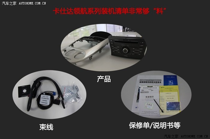 本次拆解的机子为卡仕达新凯越专用机领航系列产品,内含说明书、质保与维修手册、主机一台与各种专用接线若干、GPS接收天线1条等。