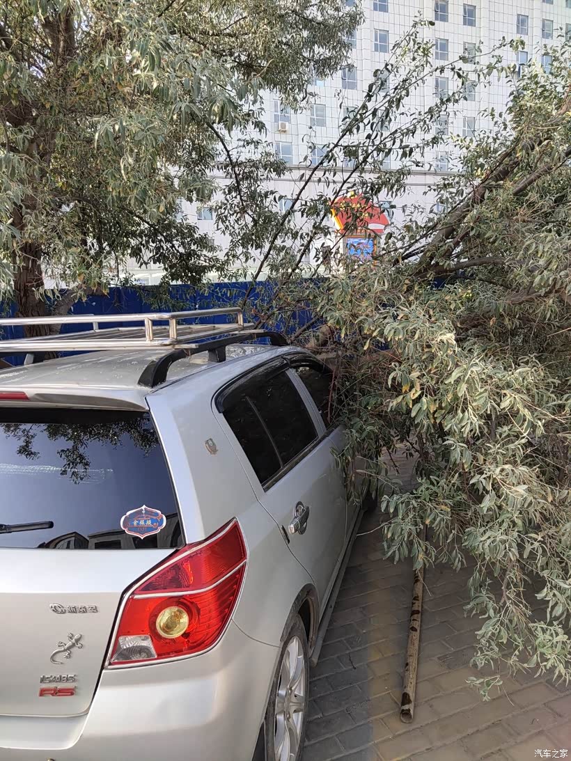 回来停在树下,结果晚上风大,出问题了,树支折了