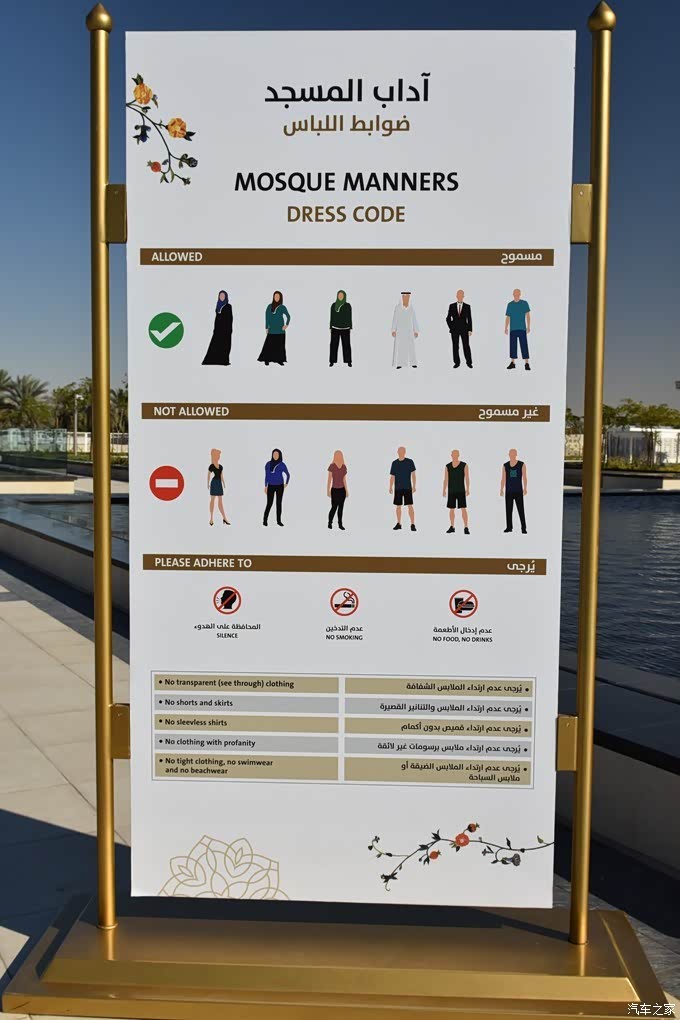 进入清真寺服装有严格的要求,具体看下图~~女更衣室免费提供阿拉伯民族服饰更换,有女工作人员帮忙指导,当然你也可以自带